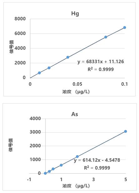 应用吉天仪器有限公司的 AFS-10B测定海水中的砷、汞,线性关系良好(线性相关系数 r 均大于 0.999),检出限分别为0.04、0.0007μg/L,符合国标要求。此方法同样适用于吉天仪器其他型号原子荧光设备。