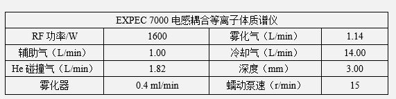 用EXPEC 7000测定5个平行样品,考察各元素的方法精密度和准确度,结果见表4。从测试结果来看,各元素的加标回收率都处在90~106%之间,证明该方法具有较高的准确度。5个平行样进行相同的前处理后上机测试,结果显示平行样各元素含量测定值之间的RSD均小于3%,证明此方法具有较好的精密度。