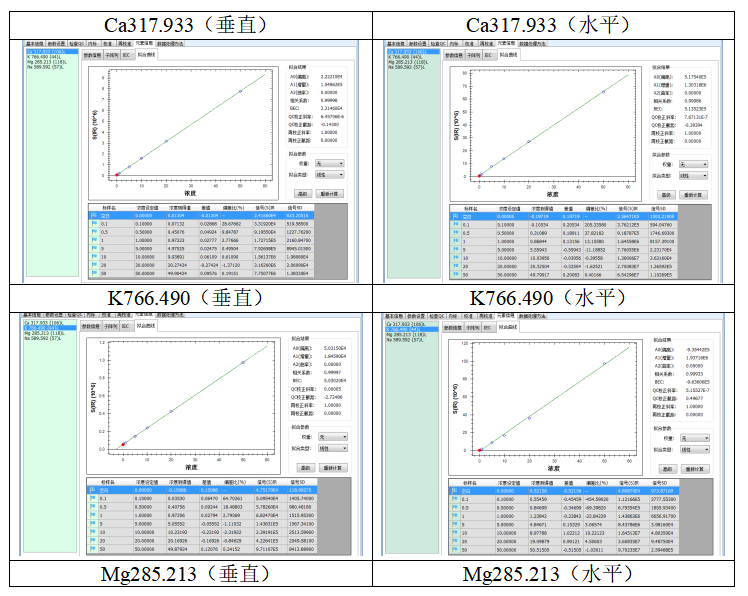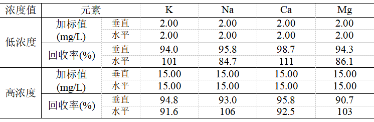 本文所述的土壤中水溶性钾、钠、钙、镁分析方法,是应用北京吉天仪器有限公司的电感耦合等离子体发射光谱仪ICP-5000测定,以5%硝酸溶液为提取液对待测物进行浸提,此方法测试线性相关系数均为0.999以上;定量重复性为 0.085%-1.4%;加标回收率为84.7%-111%。经计算此方法可满足检测需求。