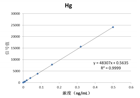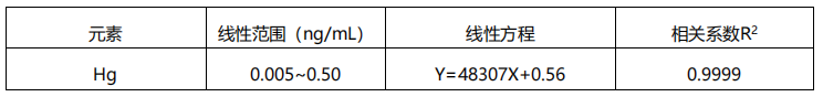 依次进样:00.00ng/mL,0.005ng/mL,0.01ng/mL,0.02ng/m,0.04ng/mL.0.08ng/mL,0.16ng/mL,0.32ng/mL 和0.50ng/mL的标准系列溶液,以元素浓度为横坐标,信号值为纵坐标,绘制标准曲线,汞的线性见图1,线性及相关系数见表1。连续进7次低浓度海水样品的浓度值,按3.143*SD计算汞的方法检出限,结果见表2。