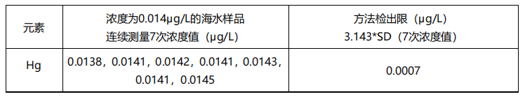 根据国标GB3097-1997《海水水质标准》,可按照海域的不同使用功能和保护目的将海水分为四类,汞的限量值分别为0.05 μg/L、0.2 μg/L、0.2 μg/L 和0.5 μg/L。其中国标GB17378.4-2007海洋检测规范 第4部分:海水分析,规定了海水中汞的分析方法,第一法即为原子荧光法。
