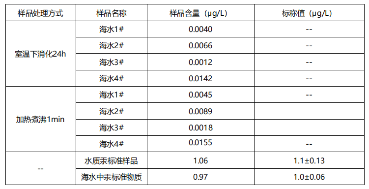 海水样品加标的处理:在量取的100mL海水中,分别准确加入0.11mL、0.22mL和 0.44mL浓度为0.1μg/mL的汞标液,后续处理同上面海水样品。