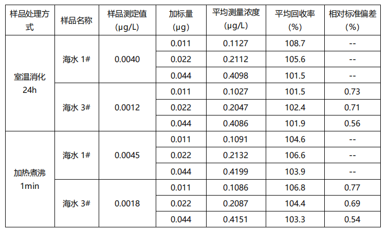 对海水1#和海水3#样品分别采用低、中、高三种不同浓度水平的加标,对加标样品平行测定7次,并计算加标回收率及相对标准偏差。