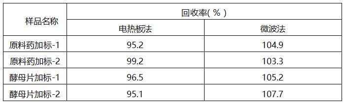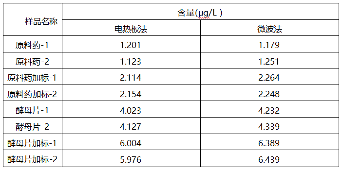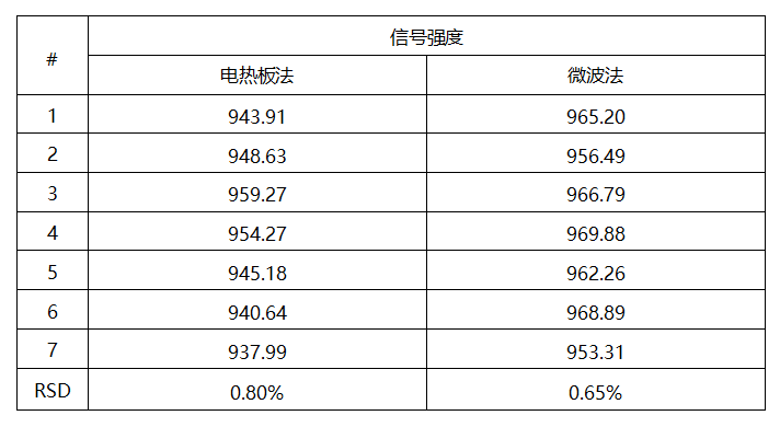 电热板法:将样品摇匀,取0.05g样品置于50mL烧杯中,加玻璃珠数粒,加入6mL盐酸和2mL硝酸,放置过夜,加盖缓慢加热消化至无色澄清溶液,去盖140℃赶酸至液体剩余 1mL左右,沿壁加入5mL盐酸、液体体积接近1mL时,待取下冷却,将溶液完全转移至50mL容量瓶中,用5%盐酸溶液洗涤烧杯,并将洗涤液合并入容量瓶中,用5%盐酸定容,摇匀。