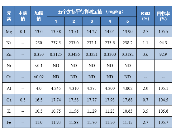 方法精密度与加标回收率:采用ICP-5000电感耦合等离子体光谱仪测定5个平行样品,考察各元素的方法精密度和回收率,方法精密度和回收率结果见下表。