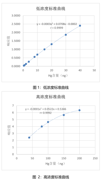 汞标准系列溶液:准确吸取汞标准使用液(10.0mg/L),用重铬酸钾-硝酸溶液(0.5g/L)逐级稀释成浓度为0.0μg/L、10.0μg/L、20.0μg/L、40.0μg/L、80.0μg/L、160.0μg/L、200.0μg/L、400.0μg/L、600.0μg/L 和 800.0μg/L的低浓度系列标准溶液;准确吸取汞标准使用液(100.0mg/L),用重铬酸钾-硝酸溶液(0.5g/L)逐级稀释成浓度为 0.80mg/L、1.6mg/L、2.0mg/L、3.0mg/L 和 4.0mg/L 的高浓度系列标准溶液。