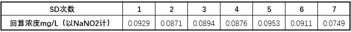| 回算浓度mg/L(以NaNO2计) | 0.1031 | 0.1059 | 0.1005 | 0.1035 | 0.0973 | 0.1053 | 0.1129 |