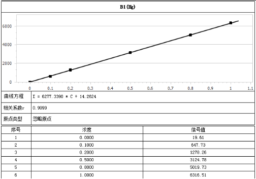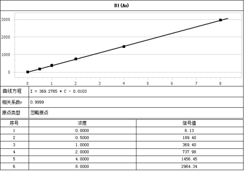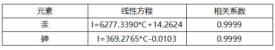 用原子荧光光谱仪对汞和砷的线性测定,结果满足实验需求。曲线图见表1,线性及相关系数见表2。