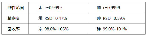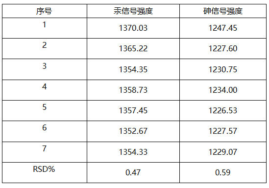 按实验方法对样品做7次平行测定,汞的相对标准偏差是0.47%,砷的相对标准偏差是0.59%,说明本方法的精密度较好,能满足测定要求,结果见表3。