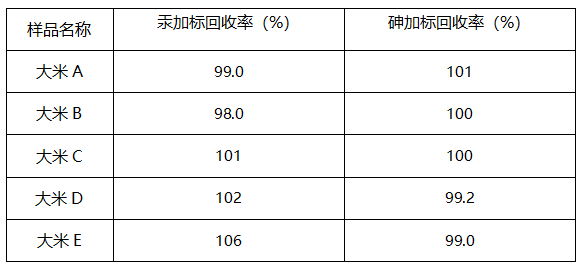 为了确证分析结果的可靠性,了解大米中有无干扰元素的存在,应用本法对样品进行加标回收试验。在样品中加入一定量的汞和砷的标液,按实验方法测定,样品和样品加标结果见表4,加标回收率见表5。