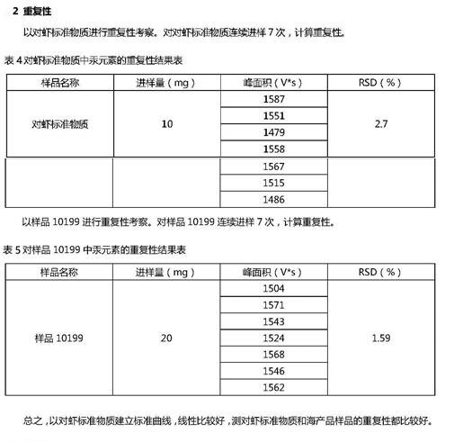 应用北京吉天仪器有限公司开发的直接进样测汞仪可以快速检测出海产品中的汞元素含量,该仪器能满足实验测量的需求,检测结果可靠,重复性好。该仪器固体样品无需进行任何前处理,可直接固体进样同时测定产品中汞元素,6分钟时间就可以得到分析结果,省时省力,分析过程无需任何化学试剂,不产生废液,简单快捷。