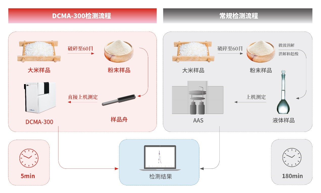 直接进样汞镉测试仪DCMA-300,可帮您在5分钟内快速检测大米中的镉含量,DCMA-300仪器操作简单,可实现固体样品直接分析,有效节省样品前处理的时间,仪器准确度高,稳定性好,符合标准LS/T 6125-2017 《粮油检验 稻米中镉的快速检测 固体进样原子荧光法》要求。对于植物性饲料原料中的镉检测,DCMA-300也符合标准NY/T3319-2018 《植物性饲料原料中镉的测定直接进样原子荧光法》要求。检测流程: