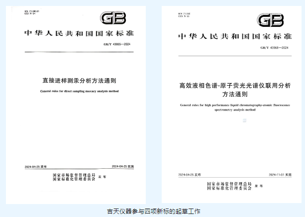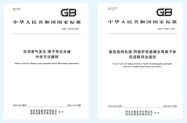 在中国农业科学院农业质量与检测技术研究所、清华大学的悉心指导下,吉天仪器荣幸参与了GB/T 43970-2024《化学蒸汽发生-原子荧光光谱分析方法通则》(4月25日发布;11月1日实施)、GB/T 43966-2024《高效液相色谱-四极杆电感耦合等离子体质谱联用法通则》(4月25日发布并实施),GB/T 43865-2024 《直接进样测汞分析方法通则》(4月25日发布并实施)及GB/T 43968-2024《高效液相色谱-原子荧光光谱仪联用分析方法通则》(4月25日发布;11月1日实施)等四项国家标准的起草工作。