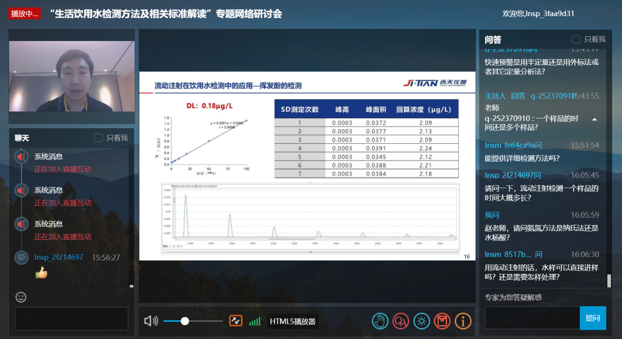水质安全是当下最受人们关注的话题之一,因为水是调节人体生命活动的重要营养物质,是人体必需的五种营养物质之一,如果饮用水发生质量安全问题,将严重影响人们的生活,生活饮用水中微生物、重金属、有毒物等物质的检测变的尤为重要。在国家饮用水产品质量监督检验中心的支持下,我要测网于3月23日至3月24日,召开“生活饮用水检测方法及相关标准解读”专题网络研讨会,会议中邀请到多名行业资深一线专家,带来相关政策法律法规的深度解读,以及近期科研成果。北京吉天仪器有限公司(以下简称“吉天仪器”)也是有幸受邀作为国产仪器厂商的报告嘉宾参加本次会议,为大家详细讲解“流动注射在生活饮用水检测中的应用及展望“。